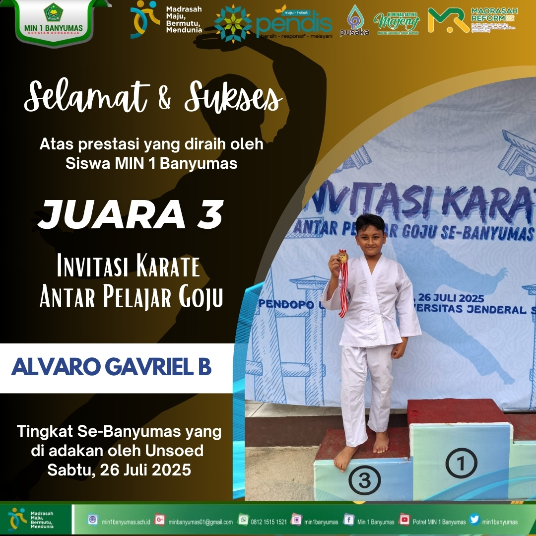 Alvaro Gavriel B siswa MIN 1 Banyumas berhasil meraih Juara 3 Invitasi Karate Antar Pelajar Goju yang diselenggarakan di Unsoed pada Sabtu, 26 Juli 2025