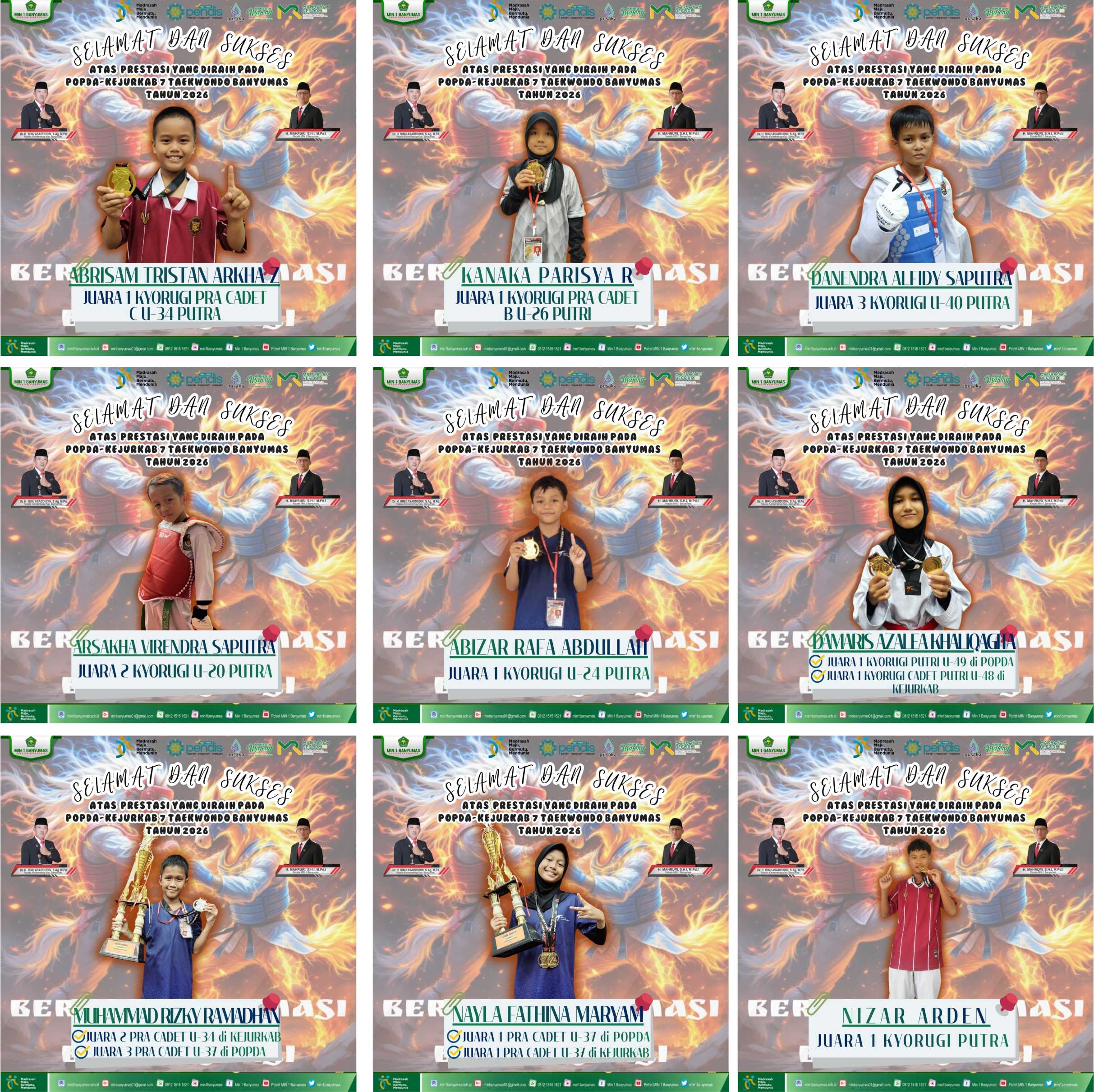 Banyumas, Prestasi membanggakan kembali ditorehkan oleh siswa-siswi Madrasah Ibtidaiyah Negeri (MIN) 1 Banyumas dalam ajang POPDA Kejuaraan Kabupaten (Kejurkab) 7 Taekwondo Banyumas Tahun 2026. Dalam kejuaraan tersebut, para atlet cilik MIN 1 Banyumas berhasil meraih sejumlah gelar juara dari berbagai kategori kyorugi.