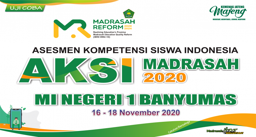 Asesmen Kompetensi Siswa Indonesia (AKSI) tahap Uji Coba mulai dilaksanakan hari ini Senin 16 November sampai 18 November 2020. MIN 1 Banyumas sebagai salah satu peserta Piloting AKSI2020 diikuti oleh seluruh siswa kelas 5 sebanyak 125 siswa dan dibagi menjadi 5 sesi, sesi 1 dan 2 sebanyak 50 siswa dilaksanakan hari ini Senin 16 November 2020, sesi 3 dan 4 sebanyak 50 siswa dilaksanakan pada hari Selasa 17 November 2020, dan sesi 5 sebanyak 25 siswa dilaksanakan pada hari Rabu 18 November 2020.
