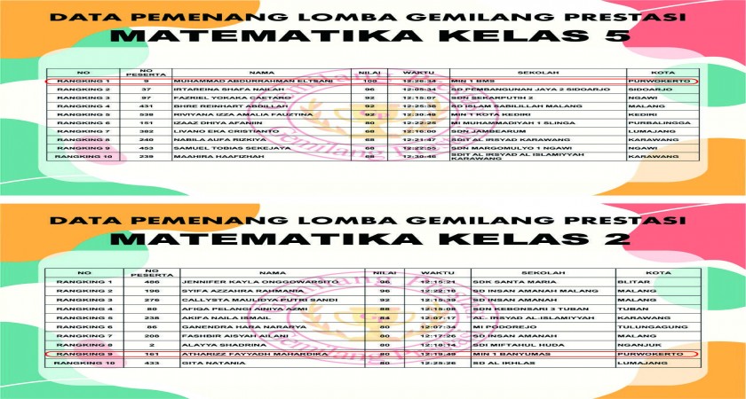 Purwokerto (16/02/2021) - MIN 1 BANYUMAS kembali berprestasi, kali ini pada Lomba Gemilang Prestasi Matematika, Muhammad Abdurrahman El Tsani (siswa kelas 5) berhasil meraih peringkat 1 Matematika kelas 5, dan Atharizz Fayyadh Mahardika (siswa kelas 2) berhasil meraih peringkat 9 Matematika kelas 2.